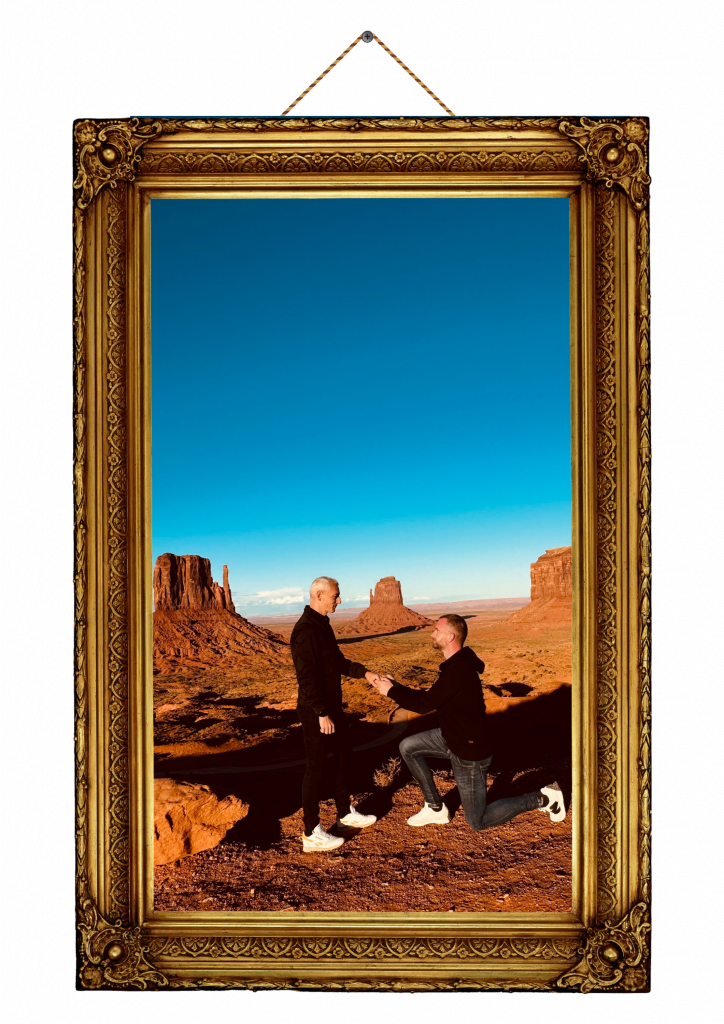 DANS LE SILENCE MAJESTUEUX DU DÉSERT, UN GENOU POSÉ ET DEUX COEURS ALIGNÉS.